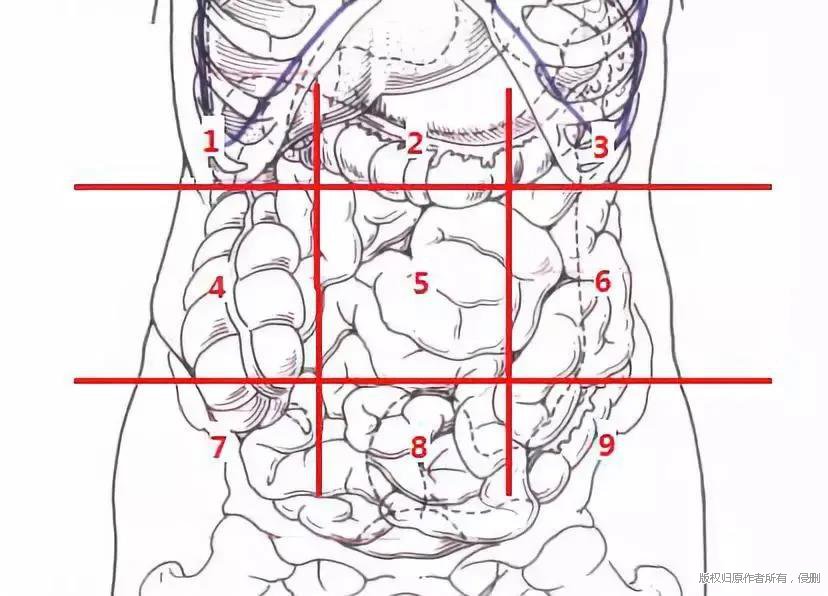 人的腹部位于骨盆和胸部之间,占很大的区域,为了准确描述腹部症状所在部位,可将腹部划分成几个区域。